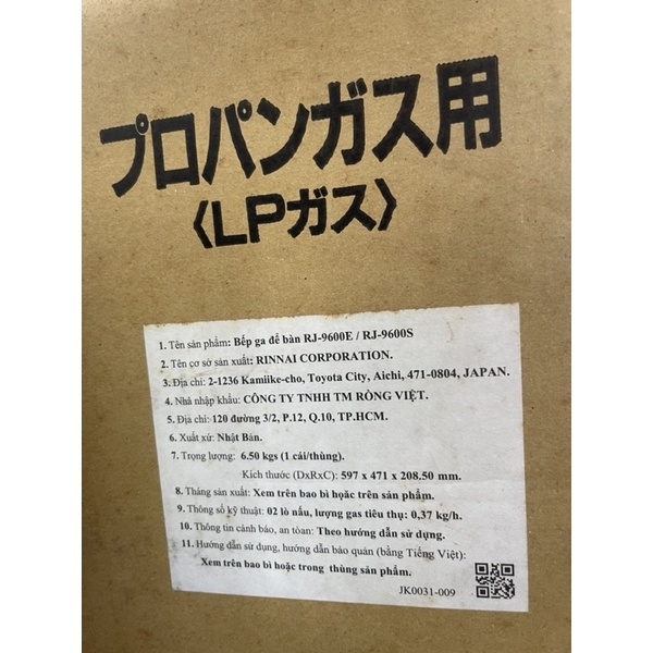 BẾP GAS RINNAI RJ-9600S. Hàng Nhật Bản bảo hành 24 tháng
