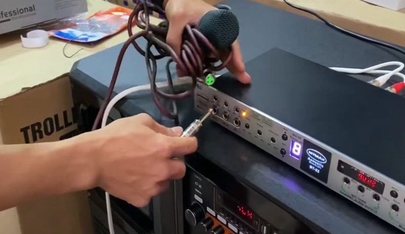 Bước 4: Cắm micro có dây vào vang, tuy nhiên, nếu bạn muốn sử dụng micro không dây cần dùng thêm bộ thu sóng cắm vào cổng Mic trên vang số.