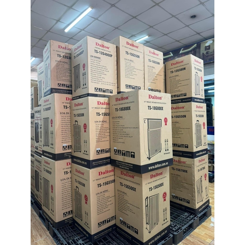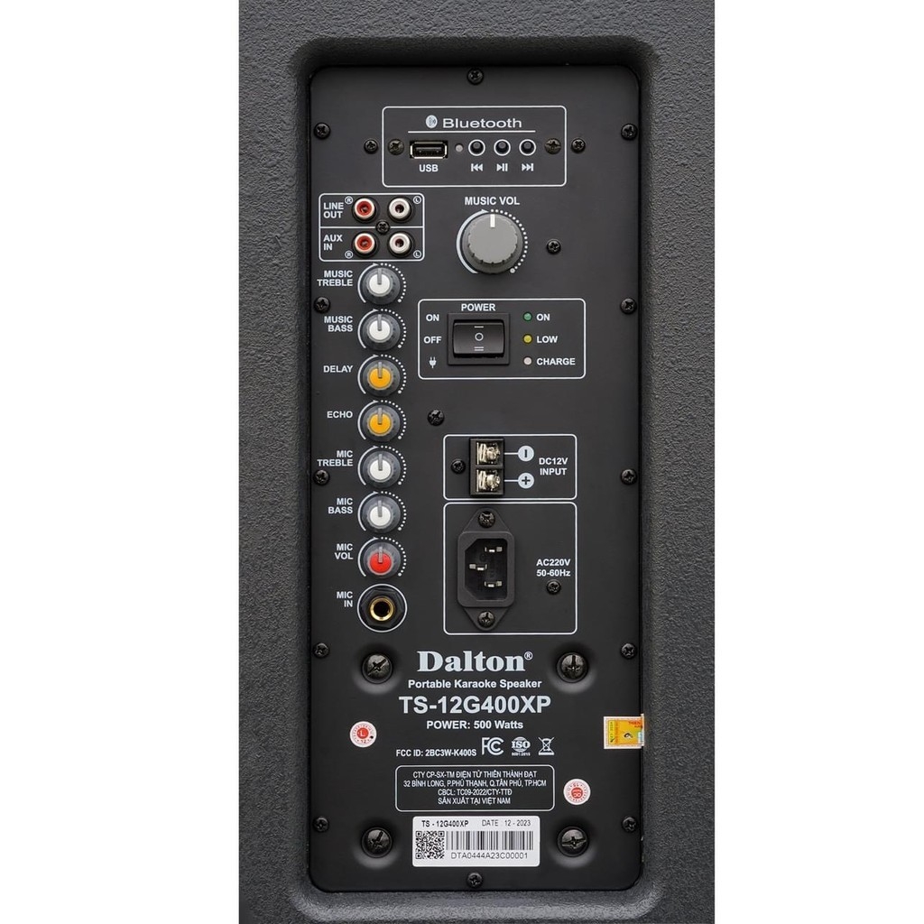 TS-12G400XP Công suất: 500W Bass loa: 12 inches Kích thước: (66 x 37.5 x 38.5) cm Trọng lượng: 28 kg ĐI KÈM MICRO KHÔNG DÂY Loa Dalton TS-12G400XP đi kèm là 02 micro không dây sóng UHF. Việc sử dụng tần số UHF giúp cho việc kết nối và truyền tín hiệu micro được chuẩn và ổn định hơn. 02 micro không dây được làm bằng chất liệu kim loại nguyên khối màu vàng lấp lánh mang đến nét thẩm mỹ và sang trọng. Đặc biệt micro không dây có khả năng chỉnh được 16 tần số kết nối. Việc này giúp cho loa tránh trường hợp trùng lặp tần số micro với các loa khác ở gần. CÔNG SUẤT MẠNH MẼ Loa kéo Karaoke Dalton với tổng công suất 500W, 1 loa Bass có đường kính 3 tấc (12 inches), 1 loa Treble 1.5 inches kết hợp họng còi lớn, loa 2 đường tiếng này phát ra âm thanh to rõ, vang dội nhưng vẫn đảm bảo được tính chi tiết, giúp bữa tiệc của bạn thêm phần sôi động hơn. Loa bass với củ từ lớn giúp đem lại tiếng trầm chắc và gọn, loa treble với thiết kế họng còi giúp cho tiếng ca trong trẻo và lan tỏa với không gian rộng. Đặc biệt mạch tạo tiếng vang ECHO được sử dụng IC 65831P của Nhật nên tiếng vang ECHO ấm và trong.
