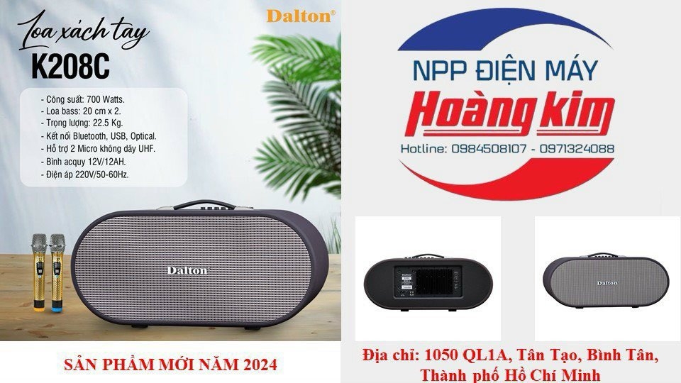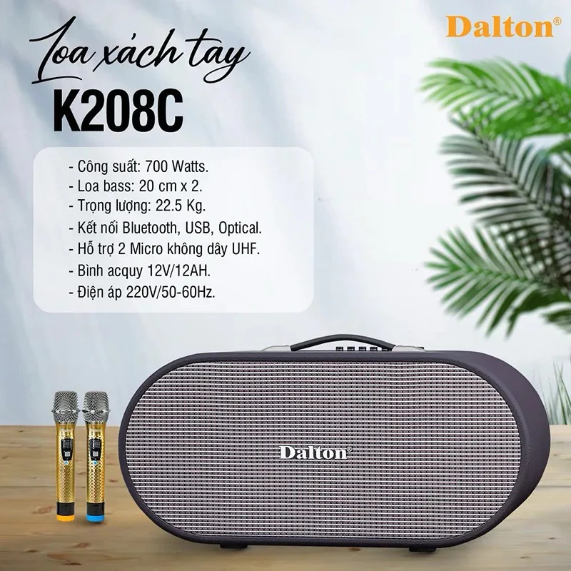 1. Thông số kỷ thuật: Hãng Loa: Dalton Model: K208C Loại loa: Di động Bass loa: 20cm (8 inch) Số lượng bass loa: 2 bass Số lượng treble loa: 1 treble Công suất RMS: 750W Nguồn sử dụng: Pin Phím điều khiển/ Nút bấm cơ học, điều khiển âm lượng, điều khiển micro, tạm dừng phát nhạc, chuyển bài hát, chuyển chế độ kết nối Số đường tiếng: 2 đường tiếng Ứng dụng mở rộng: Karaoke, Nghe nhạc Tiện ích: Kèm micro, có reverb Kết nối: Bluetooth 5.2 Cổng kết nối: AUX 3.5mm, Micro 6.5mm, Guitar, Cổng quang (Optical) Thương Hiệu: Việt Nam Bảo Hành: 12 tháng (1 Đổi 1: 7 - 15 ngày) Thời gian sạc: 5-6 tiếng Thời gian sử dụng: 3-6 tiếng Chất liệu loa: Thùng gỗ bao da cao cấp, mặt lưới khung kim loại bao vải cao cấp Kích thước (RxCxS): 610 x 300 x 295mm Trọng lượng: 22.5 kg 2. Tổng quang về loa Dalton K208C: - Loa xách tay Dalton K208C được thiết kế nhỏ gọn với các góc cạnh bo tròn, kích thước các chiều rộng, cao, sâu 610 x 300 x 295mm, trọng lượng 22,5 kg giúp dễ dàng di chuyển và sử dụng trong nhiều tình huống khác nhau. - Với khả năng định hình linh hoạt, bạn có thể dễ dàng đặt loa để phù hợp với các không gian và nhu cầu sử dụng khác nhau. - Thân loa xách tay Dalton K208C được làm từ gỗ cứng cáp, chắc chắn và tích hợp tay xách vững chắc, giúp bạn dễ dàng mang theo và sử dụng ở mọi nơi một cách thuận tiện. - Đảm bảo rằng loa karaoke di động Dalton sẽ mang lại trải nghiệm âm thanh chuyên nghiệp nhất cho mỗi bữa tiệc của bạn. * Âm thanh mạnh mẽ: - Loa xách tay Dalton K208C mang đến âm thanh mạnh mẽ và chi tiết nhờ vào cấu trúc loa được thiết kế dựa trên các công nghệ độc quyền của Dalton. - Với 2 củ loa bass 20cmvà 1 loa treble cho chất âm trong trẻo, chi tiết, chơi tốt nhiều thể loại nhạc. * Công suất 750W: - Tổng công suất của hệ thống loa xách tay Dalton K208C lên tới 750W, mạch khuếch đại class AB hoàn hảo cho cả không gian nghe nhạc và karaoke trong và ngoài trời. Với chất âm ấn tượng, loa không chỉ giúp bạn thưởng thức nhạc một cách tuyệt vời mà còn cho phép bạn thể hiện các ca khúc yêu thích một cách xuất sắc. * Đa dạng kết nối: - Loa karaoke xách tay Dalton K208C tích hợp công nghệ Bluetooth 5.2 giúp kết nối nhanh chóng và ổn định với các thiết bị di động và máy tính mở ra các cơ hội phát nhạc không dây. - Bên cạnh bluetooth và USB, sản phẩm còn hỗ trợ các cổng kết nối khác như jack 3.5mm, jack mic 6.5mm, jack guitar 6.5mm và kết nối Optical, tạo ra sự linh hoạt trong việc kết nối với nhiều thiết bị khác nhau. * Thời lượng pin 3-6 giờ: - Loa karaoke mini Dalton K208C cũng tích hợp bình acquy có thể phát nhạc lên đến 3-6 giờ, và được cung cấp nguồn từ cấp AC 12V giúp bạn có thể sử dụng lâu dài hơn mà không cần lo lắng về nguồn điện. * Đi kèm 2 tay micro: - Với 2 micro không dây chất lượng cao, sản phẩm này giúp người dùng trải nghiệm karaoke một cách tự do và thuận tiện mà không cần phải lo lắng về dây cáp.