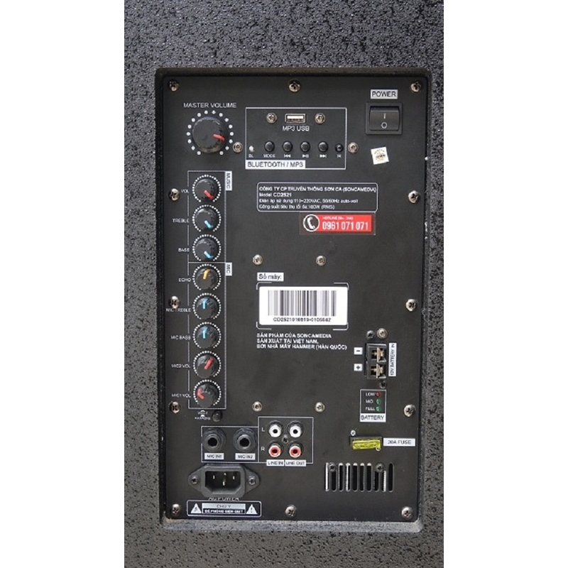 - Có thể gắn thêm bình điện. Ngoài ra, loa được gắn thêm bánh xe chắc chắn, dễ dàng di chuyển.