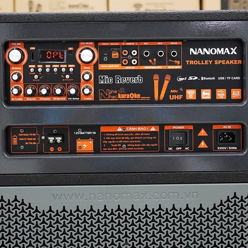 Loa karaoke điện Nanomax PRO-803 được chế tác với đường nét gọn gàng, hình dạng tối giản, sang trọng với gam màu đen phối xám sang trọng, thùng loa bằng chất liệu gỗ sơn chống trầy, mặt trước dạng lưới bằng kim loại cho độ bền cao, phát âm thanh hay hơn, thiết kế bánh xe nằm bên dưới thân loa và tay cầm được thiết kế ở bên hông cho bạn dễ dàng kéo đẩy, di chuyển loa đến bất kỳ vị trí nào bạn muốn mà không tốn nhiều công sức. THÔNG SỐ KỸ THUẬT LOA KÉO BASS ĐÔI NANOMAX PRO-803: • Sản phẩm: Loa KaraOke di động • Tên hãng: NANOMAX • Model: Pro-803 • Công suất tối đa: 1800W • Sử dụng nguồn điện: AC 220V/50Hz hoặc Ăc qui 12V • Loa Bass: 2 loa • Loa Treble: 2 loa • Kích thước loa Bass: 40 cm x2 • Loa Treble: Treble họng còi x2 • Kết nối tín hiệu Bluetooth: Bluetooth 5.0 • Kết nối Micro không dây: Mic hoạt động trên Bank tần UHF, điều chỉnh được tần số • Kết nối USB - Thẻ nhớ: Cổng USB 2.0 - thẻ SD • Kết nối tín hiệu số: Cổng Optical • Kết nối Micro có dây: Jack cắm chuẩn 6.5 li x 2 cổng • Kết nối thiết bị ngoài (Đầu đĩa, TV, ...): Jack cắm RCA • Chất liệu thùng Loa: Gỗ ép sơn gai chống thấm chống trầy • Kích thước thùng gỗ: (94 x 45 x 77)cm • Trọng lượng: 70Kg Tất cả sản phẩm luôn được test kĩ càng và đóng gói cẩn thận trước khi gửi nên giảm được 99% hư hỏng. Quý khách muốn kiểm tra hàng trước khi nhận thì nên yêu cầu shipper gọi shop khi giao hàng. Bộ loa karaoke: loa, 2 mic, dây sạc, 4 pin AA, 1 tờ hướng dẫn của hãng, 1 tờ hướng dẫn chi tiết của Nam Hoàng, bên ngoài bọc 2 lớp chống sốc. Liên hệ shop ngay sau khi nhận hàng nếu cần hướng dẫn dùng loa. BẢO HÀNH LOA KẸO KÉO NANOMAX: • 1 đổi 1 bị lỗi khi nhận • Bass và mạch: 12 tháng • Mic và ắc quy: 6 tháng Shop tự tin và cam kết về chất lượng sản phẩm, chúng tôi luôn mong muốn mang sản phẩm tốt nhất tới tay quý khách. #loabluetooth #loakaraoke #loakeo #loakeokeo #nanomax #loakeodidong #loadidong #loahatkaraoke #loakeobass30 #loakeo3tac #loakeodien #mickaraoke #loakeokaraoke #loakaraokegiare #loakeonanomax #loakaraokedidong #loahatkaraoke